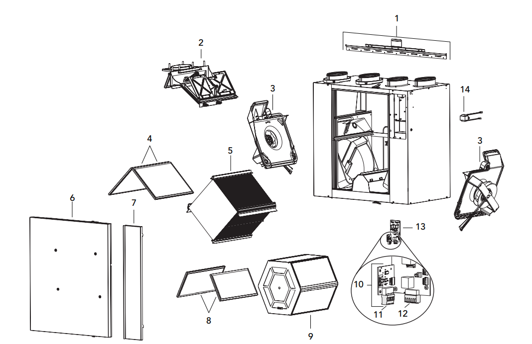 Diagram # Part # Description G2400E G2400H G3000E G3000H 1 63419 Bracket kit 1 1 1 1 2 63420 Damper system assembly (comes with warm side thermistor) 1 1 1 1 3 63421 Blower assembly 1 1 1 1 4 63426 HRV Core filter (2) — 1 — 1 63433 ERV Core filter (2) — — 1 — 5 63422 Heat Recovery Core — 1 — — 63243 Heat Recovery Core — — — 1 63425 Energy Recovery Core — — 1 — 6 63428 Door assembly 1 1 1 1 7 63430 Right panel 1 — — — 62500 Right panel — 1 — — 62502 Right panel — — 1 — 62504 Right panel — — — 1 8 63427 ERV Core filter (2) 1 — — — 9 63424 Energy recovery core 1 1 1 1 10 63437 Daughter board 1 1 1 1 11 63434 PCB Connector (Main control) 1 1 1 1 12 63435 PCB (Auxiliary control) 1 1 1 1 13 63436 PCB (Nos. 10 & 12) SV63436 SV63441 SV63442 SV63443 * 61233 Warm side thermistor kit 1 1 1 1 * 19060 Door magnetic switch 1 1 1 1 * 19060 Plastic screw (6) 1 1 1 1 * 63440 Hardware kit 1 1 1 1 * not shown in image