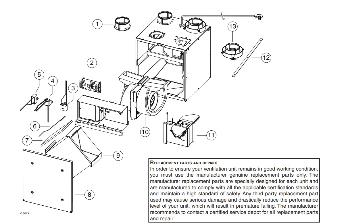 Diagram # Part # Description Quantity 1 18854 4" Round Metal Port 2 2 19206 Electronic Board (HRV) 1 3 16042 Capacitor 5 μF 1 4 61232 Transformer 1 5 19211 Capacitor 13 μF 1 6 19208 Filter retaining wires (pair) 1 7 18883 Core filters (pair) 1 8 19203 Door assembly 1 9 19199 Heat recovery core 1 10 62176 Blower assembly 1 11 18868 Vertical ports damper system 1 12 19212 4" Ports straps 2 13 18855 4" double collar port with damper 2 14 19213* Hardware kit 1 15 16416 PCB Connector 1 If you are looking to order service parts, please call our office at 1-800-665-3336 x 129.