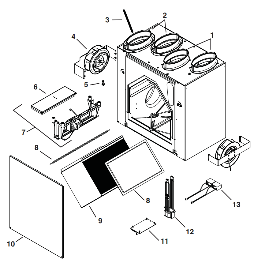 Diagram # Part # Description 60H-V+ 90H-V+ 1 18206 Oval port 2 2 2 18207 Double collar oval port 2 2 3 18221 Exhaust damper spring 1 1 4 18197 Motor assembly 2 2 5 18220 Balancing tool 2 2 6 18199 Defrost damper 1 1 7 18204 Core filter 2 2 8 18204 Core filter 2 2 9 62178 Heat recovery core 1 1 10 18208 Door assembly 1 1 11 62255 Circuit board 1 1 12 18219 Transformer 1 1 13 16042 Capacitor 5 μF 1 — 61550 Capacitor 6 μF — 1 62177 Capacitor 17 μF 1 — * 15749 Thermistor kit 1 1 * 08304 Hardware kit 1 1 * 16416 PBC Connector 1 1 * 62715 Exhaust damper cable 1 1 * not shown in image