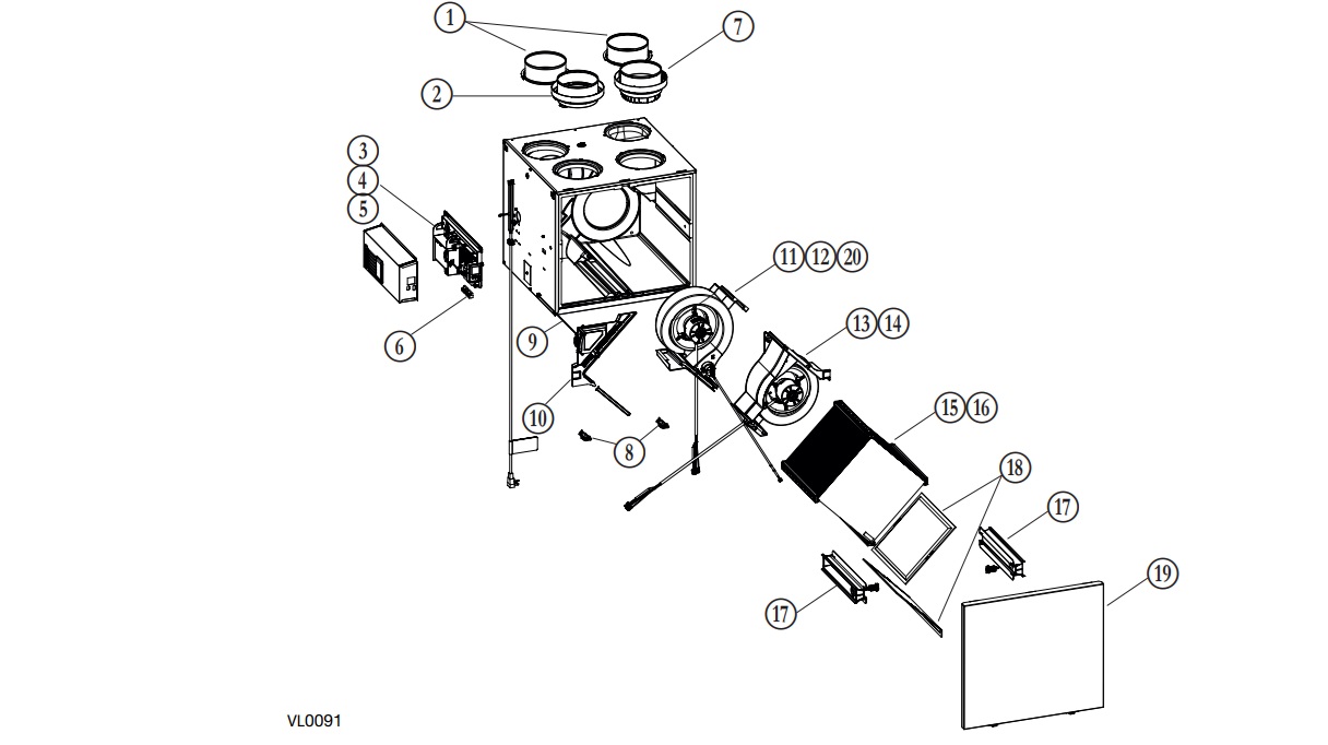 Diagram # Part # Description Quantity 1 SV66139 6" Port Warm Side 2 2 SV66135 6" Metal Port Motorized Damper 1 3 SV68027 Electronic assembly 1 4 SV68028 Electronic assembly with cooling fan kit *Not necessary for this model* 5 SV68031 Cooling fan kit for electronic *Not necessary for this model* 6 SV66145 Terminal Blocks 1 7 SV66137 6" Exhaust port assembly 1 8 SV61218 Door latches and keepers for door 1 9 SV66134 Thermistor 1 10 SV68029 Recirculation damper with thermistor 1 11 SV68022 Exhaust blower assembly with damper 1 12 SV68024 Exhaust blower assembly with damper *Not necessary for this model* 13 SV68021 Supply blower assembly 1 14 SV68023 Supply blower assembly *Not necessary for this model* 15 SV68018 Core ERV 75% 1 16 SV68019 Core HRV 75% *Not necessary for this model* 17 SV68026 Core sliders kit with screws 1 18 SV68020 MERV8 Filters kit 1 19 SV68025 Door 1 20 SV68025 Exhaust damper 1 * SV66146 Hardware kit 1 * SV66147 Fuse for PCB 1 * SV00592 1/2" Hose 1 If you are looking to order service parts, please call our office at 1-800-665-3336 x 129.